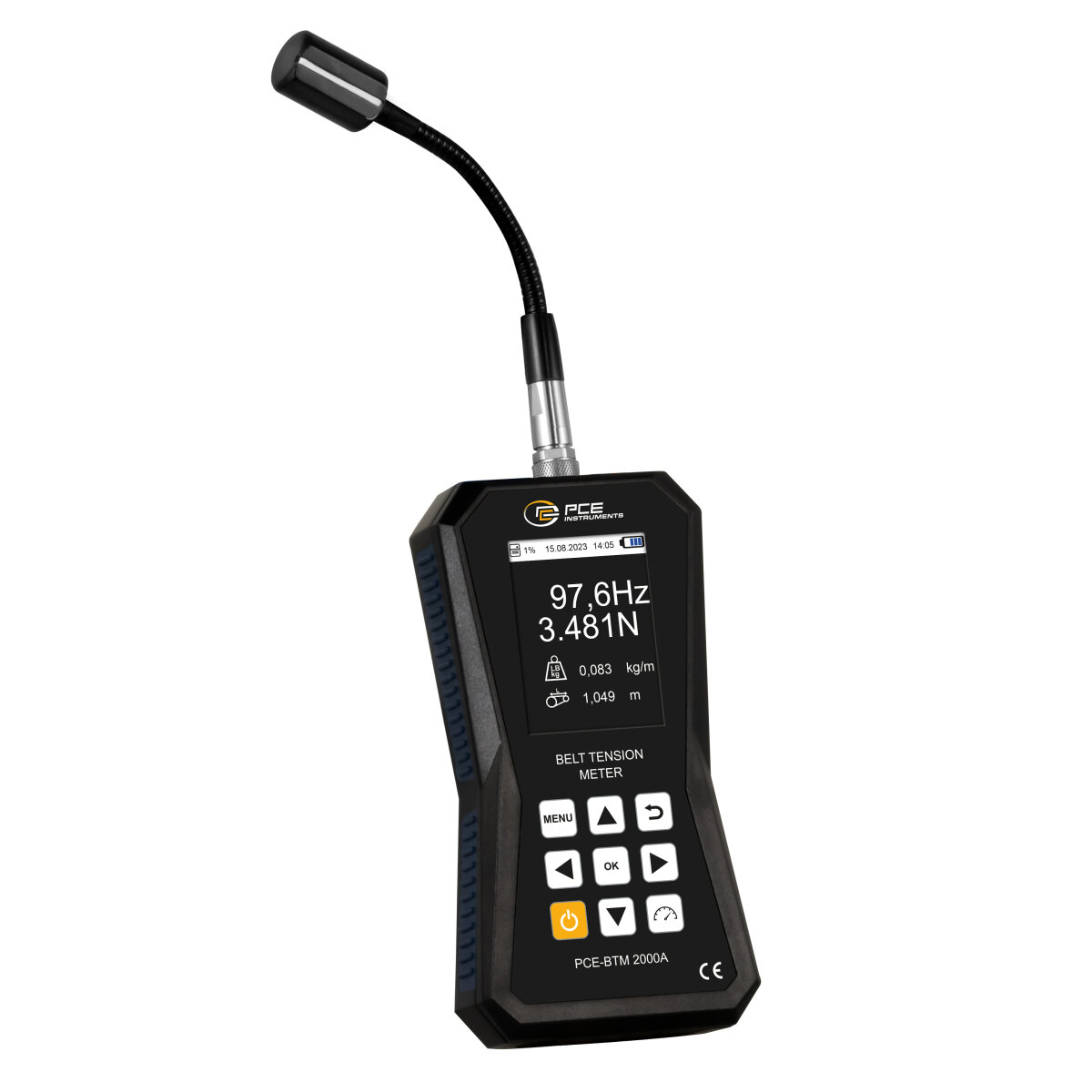 Das Riemenspannungsmessgerät misst die Trumkraft und die Frequenz des Riemens im stillstehenden Zustand. Ein kleiner Impuls auf den Riemen reicht aus, um ihn in Schwingung zu versetzen. Das Riemenspannungsmessgerät erfasst dank seines Sensors die so erzeugte Eigenfrequenz des Riemens und visualisiert diese auf dem großen, beleuchteten Display. Aus der Riemenfrequenz und der optional eingegebenen Riemenlänge und Riemenmasse kann das Vorspannungsmessgerät direkt die Spannkraft des Riemens ermitteln. Mit dem Riemenspannungsmessgerät kann der Benutzer die Riemenspannung in dem zu steuernden System aus Riemenscheiben bestimmen und Sofortmaßnahmen treffen, um die Spannung auf den Sollwert einzustellen. Die Messung der Riemenspannung erfordert hohe Präzision, das Vorspannungsmessgerät führt sie schnell und zuverlässig durch.