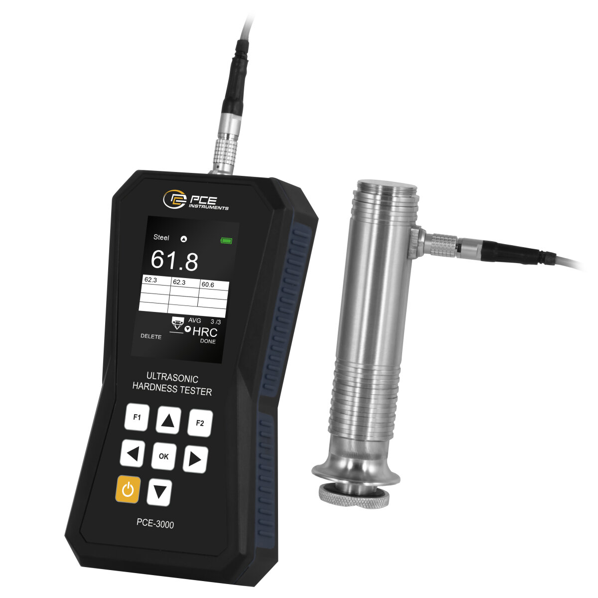 Das Ultraschall Härteprüfgerät verfügt über verschiedene Messmodi, darunter Einzelmessung und Durchschnittsbildung aus 3, 5 oder 10 Messungen. Die Ergebnisanzeige mit Toleranzbewertung zeigt direkt an, ob die gemessenen Werte innerhalb des definierten Bereichs liegen. Die UCI-Kalibrierung ist für verschiedene Materialien wie Stahl, Edelstahl, Aluminium, Messing und benutzerdefinierte Werkstoffe möglich. Die Bedienung erfolgt über ein intuitives Menü mit Navigationstasten und Funktionstasten.